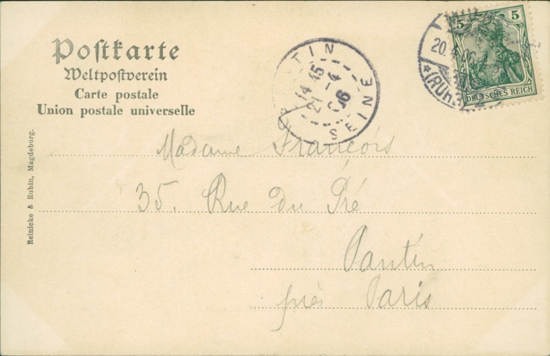Alte Ansichtskarte aus Mülheim an der Ruhr, gelaufen am 20.04.1906 von Mülheim (Ruhr) nach Pantin. Ankunft in Pantin am 21.04.1906.