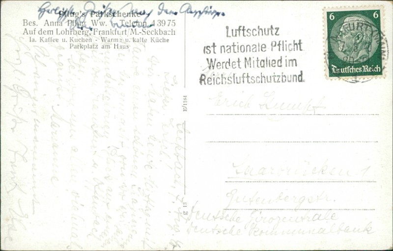 Alte Ansichtskarte aus Frankfurt-Seckbach, gelaufen am 07.08.1940 von Frankfurt (Main) nach Saarbrücken.