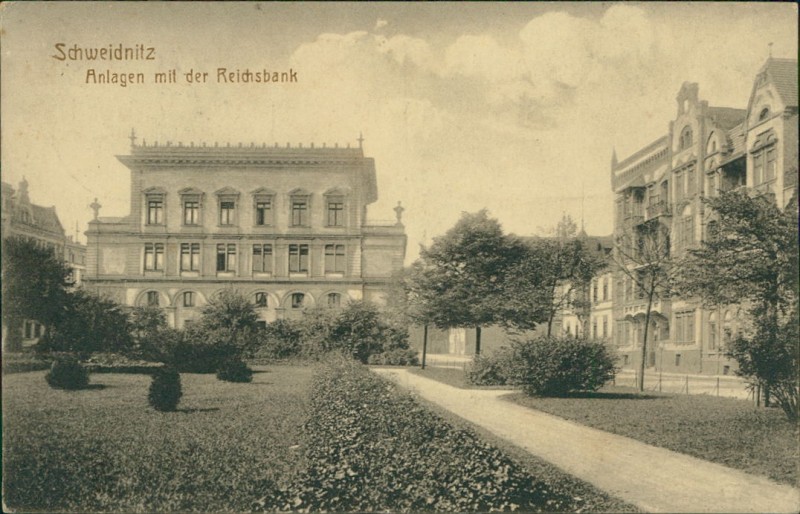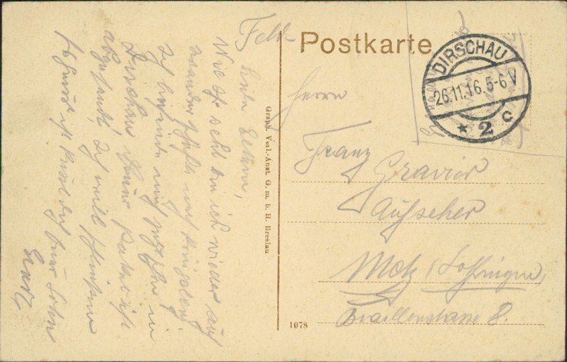 Alte Ansichtskarte aus Schweidnitz / Świdnica, gelaufen am 26.11.1916 von Dirschau nach Metz/Lothringen.