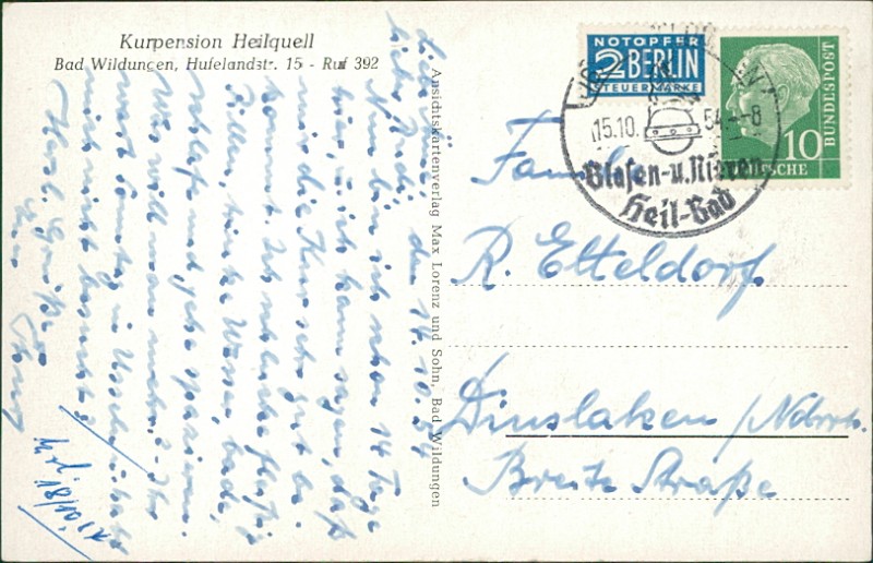 Alte Ansichtskarte aus Bad Wildungen, gelaufen am 15.10.1954 von Bad Wildungen (Ortswerbestempel) nach Dinslaken.