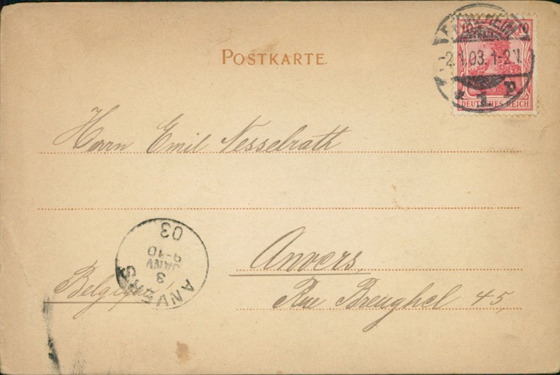 Alte Ansichtskarte aus Pforzheim-Weißenstein, gelaufen am 02.01.1903 von Pforzheim nach Anvers. Ankunft in Anvers am 03.01.1903.