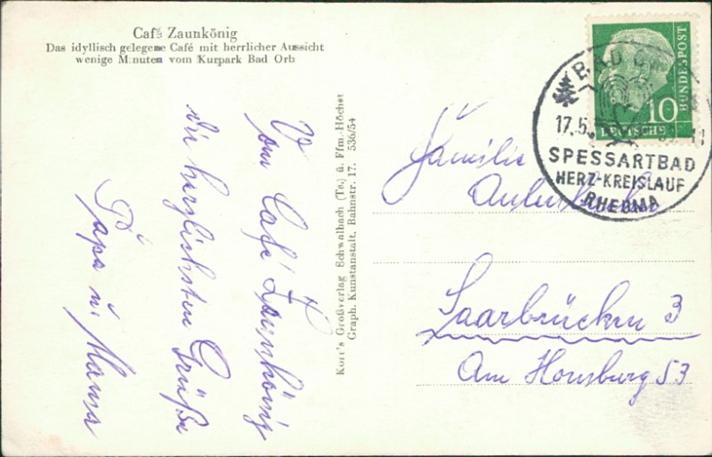 Alte Ansichtskarte aus Bad Orb, gelaufen am 17.05.1953 von Bad Orb (Ortswerbestempel) nach Saarbrücken.