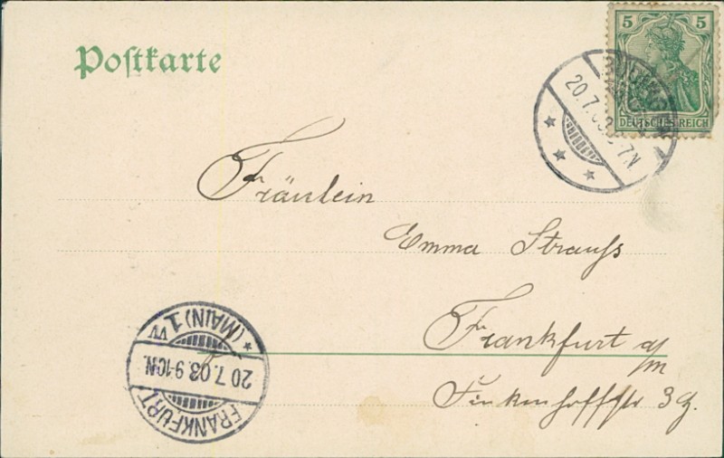 Alte Ansichtskarte aus Büdingen, gelaufen am 20.07.1903 von Büdingen nach Frankfurt. Ankunft in Frankfurt am 20.07.1903.