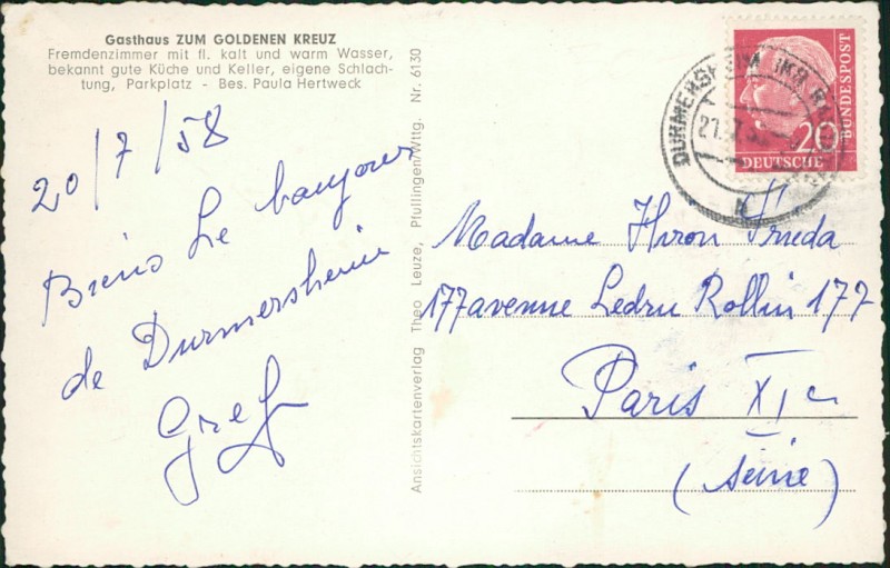 Alte Ansichtskarte aus Durmersheim, gelaufen am 21.07.1958 von Durmersheim nach Paris.