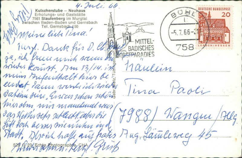 Alte Ansichtskarte aus Gernsbach-Staufenberg, gelaufen am 05.07.1966 von Bühl nach Wangen/Allg.