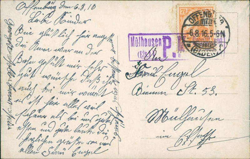 Alte Ansichtskarte aus Offenburg, gelaufen am 06.08.1916 von Offenburg (Baden) nach Mülhausen im Elsass.