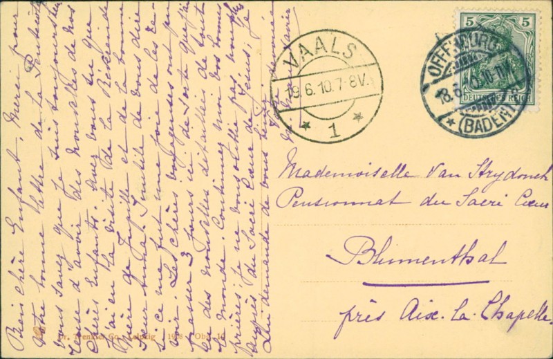 Alte Ansichtskarte aus Offenburg, gelaufen am 18.06.1910 von Offenburg (Baden) nach Vaals. Ankunft in Vaals am 19.06.1910.