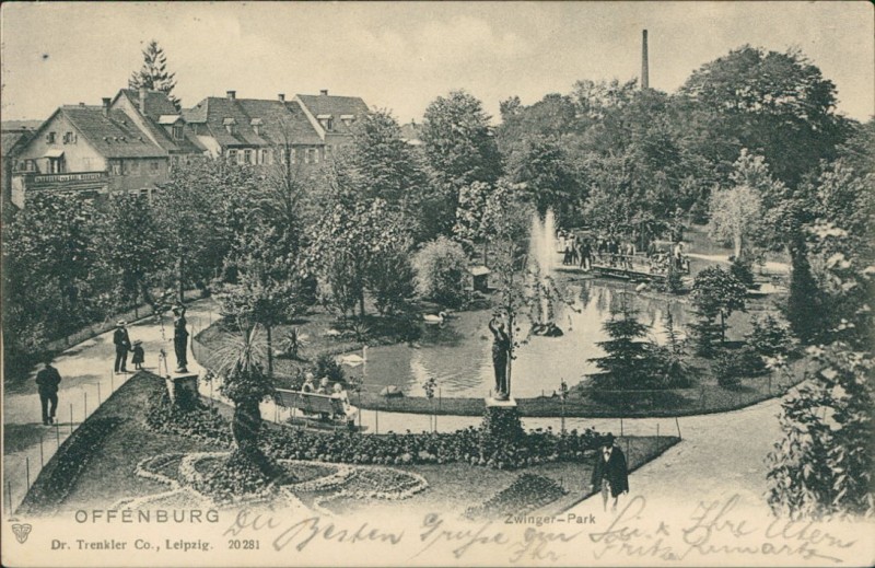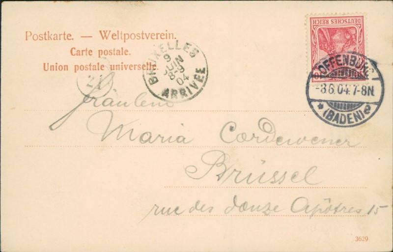 Alte Ansichtskarte aus Offenburg, gelaufen am 03.06.1904 von Offenburg (Baden) nach Brüssel. Ankunft in Brüssel am 09.06.1904.