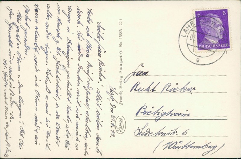 Alte Ansichtskarte aus Lahr/Schwarzwald, gelaufen am 24.04.1942 von Lahr (Schwarzwald) nach Bietigheim.