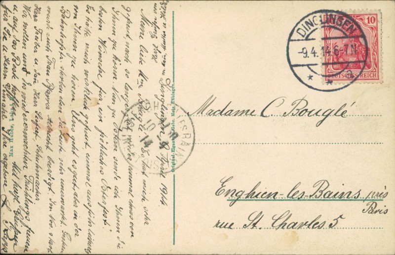 Alte Ansichtskarte aus Lahr/Schwarzwald, gelaufen am 09.04.1914 von Dinglingen nach Enghien-les-Bains.