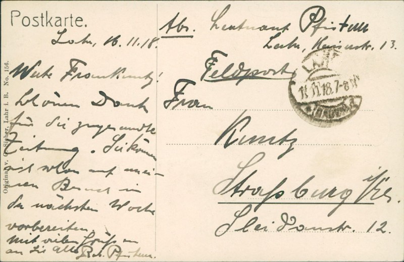 Alte Ansichtskarte aus Lahr/Schwarzwald, gelaufen am 16.11.1918 von Lahr (Baden) nach Straßburg i/Els.