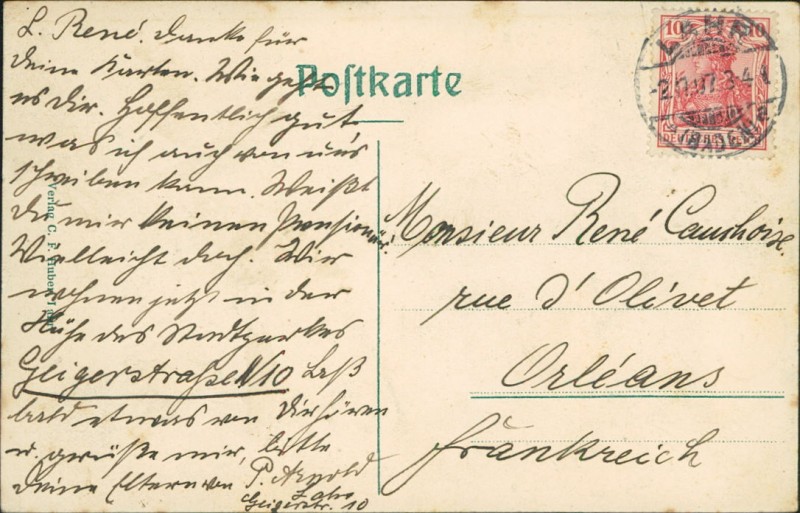 Alte Ansichtskarte aus Lahr/Schwarzwald, gelaufen am 02.11.1907 von Lahr (Baden) nach Orléans.