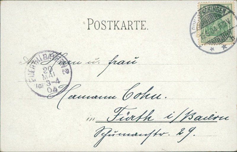 Alte Ansichtskarte aus Donaueschingen, gelaufen am 19.05.1904 von Donaueschingen nach Fürth i. Bayern. Ankunft in Fürth i. Bayern am 20.05.1904.