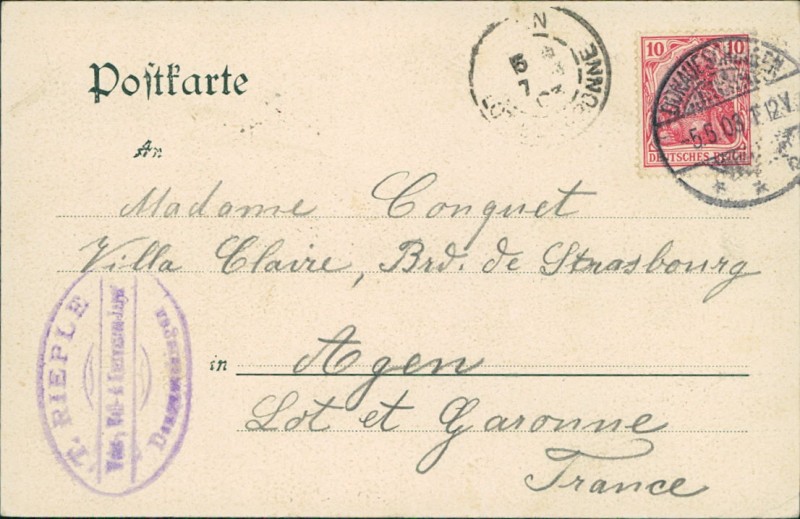 Alte Ansichtskarte aus Donaueschingen, gelaufen am 05.05.1903 von Donaueschingen nach Agen.