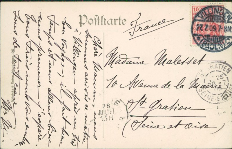 Alte Ansichtskarte aus Villingen-Schwenningen, gelaufen am 27.07.1909 von Villingen (Baden) nach St. Gratien. Ankunft in St. Gratien am 28.07.1909.