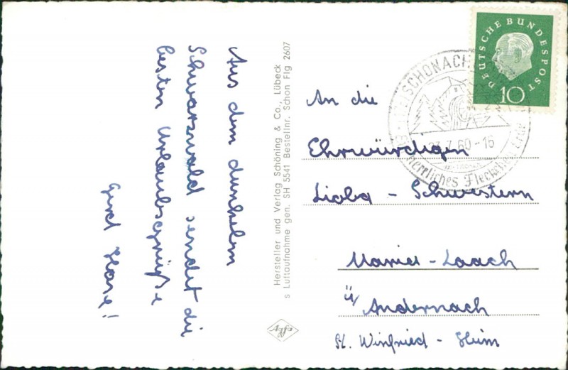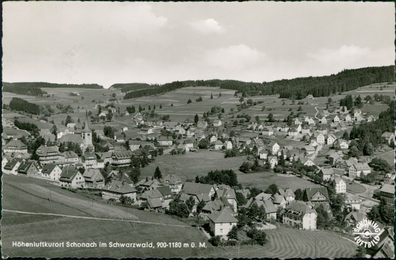 Alte Ansichtskarte aus Schonach im Schwarzwald, gelaufen am 23.07.1960 von Schonach nach Maria Laach.