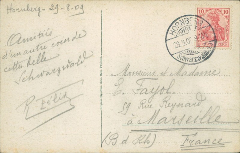 Alte Ansichtskarte aus Hornberg, gelaufen am 29.08.1909 von Hornberg nach Marseille.