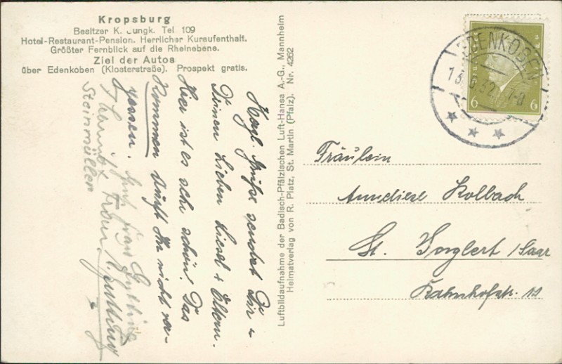 Alte Ansichtskarte aus Sankt Martin, gelaufen um 0 von 13.06.1932 nach Edenkoben.