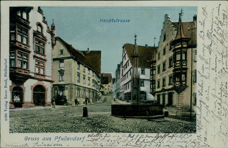Alte Ansichtskarte aus Pfullendorf, gelaufen am 18.05.1903 von Aach-Linz nach Paris.