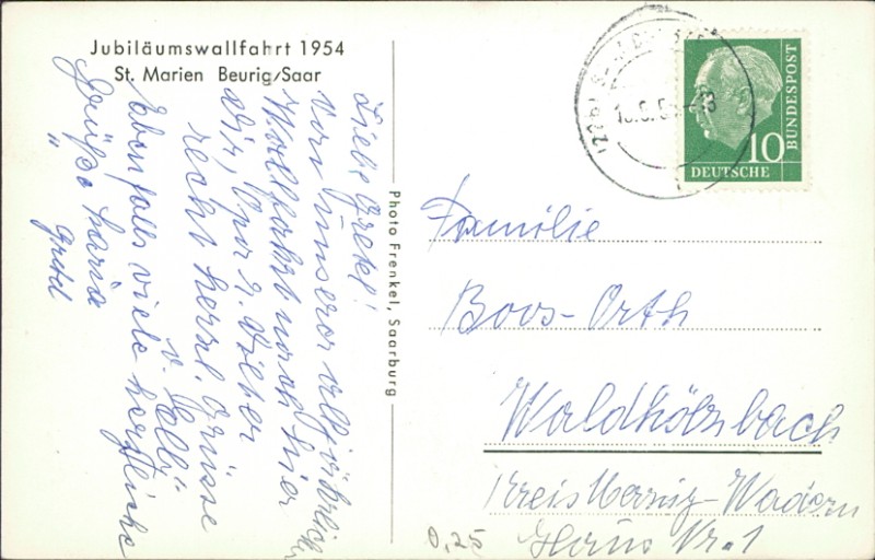 Alte Ansichtskarte aus Saarburg-Beurig, gelaufen um 1954 von Saarburg nach Waldhölzbach.