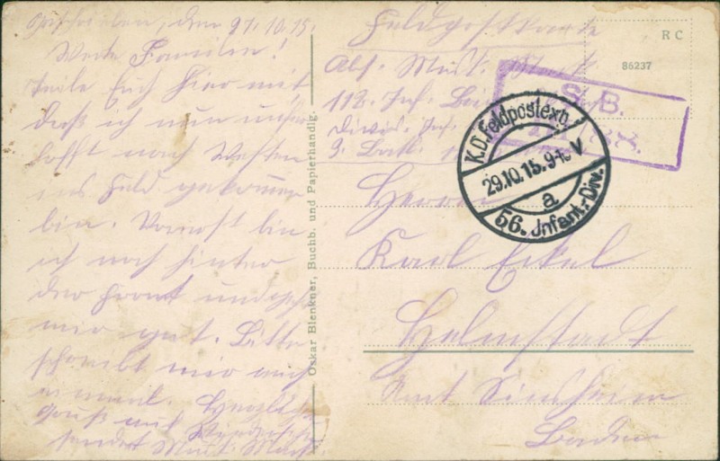Alte Ansichtskarte aus Emmendingen, gelaufen am 29.10.1915.