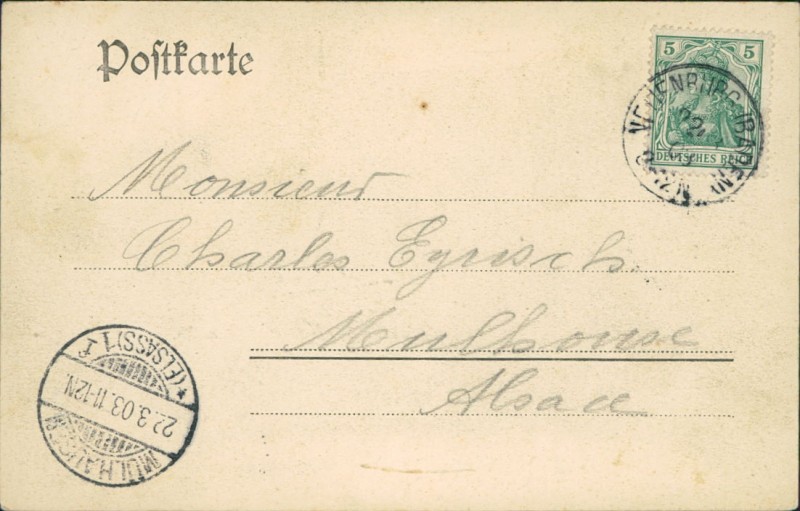 Alte Ansichtskarte aus Neuenburg am Rhein, gelaufen am 22.03.1903 von Neuenburg (Baden) nach Mulhouse. Ankunft in Mulhouse am 22.03.1903.