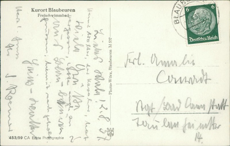 Alte Ansichtskarte aus Blaubeuren, gelaufen am 02.08.1937.