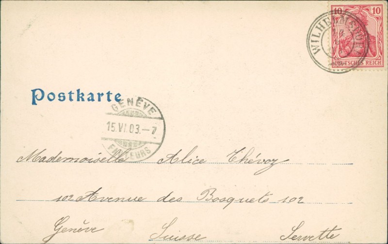 Alte Ansichtskarte aus Wilhelmsdorf, gelaufen am 14.06.1903 von Wilhelmsdorf nach Geneve. Ankunft in Geneve am 15.06.1903.