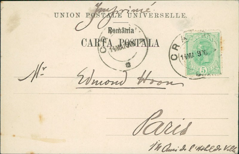 Alte Ansichtskarte, gelaufen am 14.05.1900 von Craiova nach Paris.