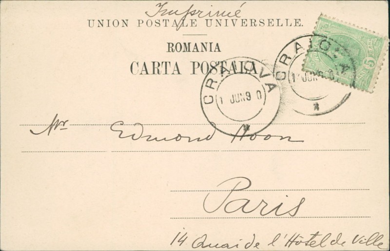 Alte Ansichtskarte, gelaufen am 01.06.1900 von Craiova nach Paris.