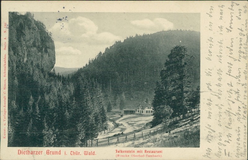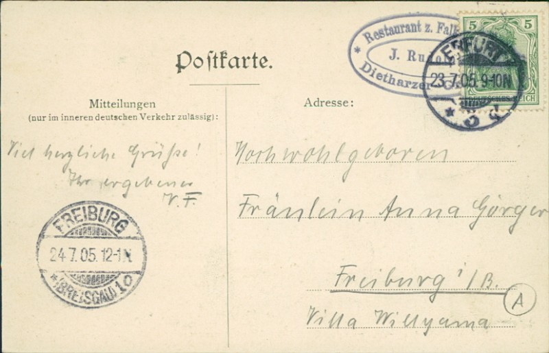 Alte Ansichtskarte aus Dietharz, gelaufen am 23.07.1905 von Erfurt nach Freiburg (Breisgau). Ankunft in Freiburg (Breisgau) am 24.07.1905.