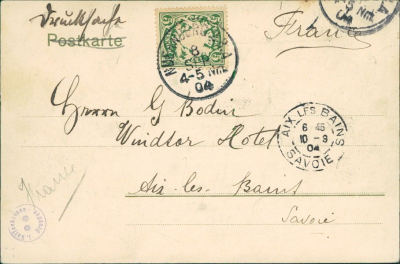 Alte Ansichtskarte aus Fürth, gelaufen am 08.09.1904 von Nürnberg nach Aix-les-Bains. Ankunft in Aix-les-Bains am 10.09.1904.