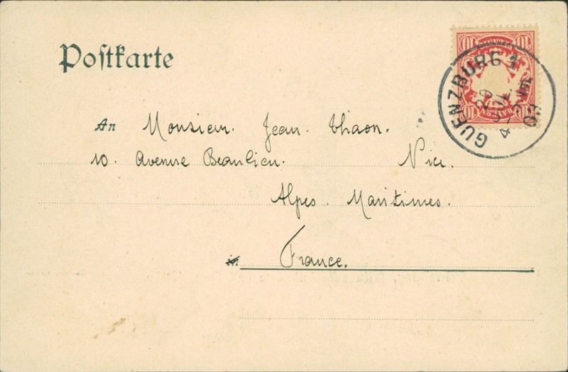 Alte Ansichtskarte aus Günzburg, gelaufen am 20.07.1903 von Guenzburg nach Nice.