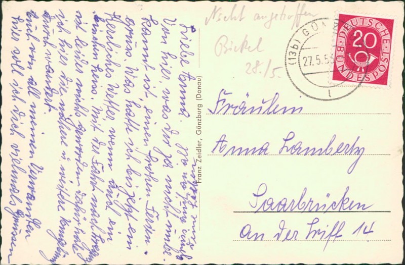 Alte Ansichtskarte aus Günzburg, gelaufen am 27.05.1953 von Günzburg nach Saarbrücken.
