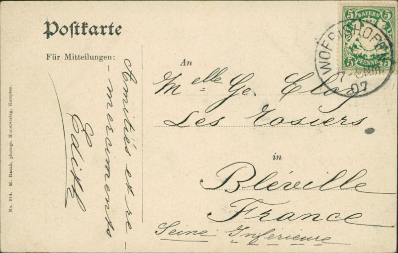 Alte Ansichtskarte aus Bad Wörishofen, gelaufen am 26.08.1907 von Woerishofen nach Bléville.