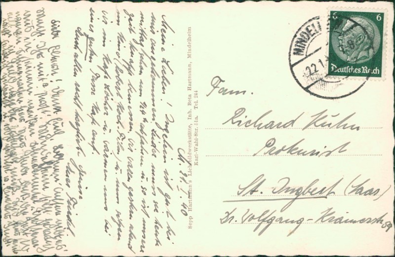 | Verlag | Sepp Hartmanns Lichtbildwerkstätte, Inh. Beta Hartmann, Mindelheim, Karl-Wahl-Str. 51a. Tel. 244 |