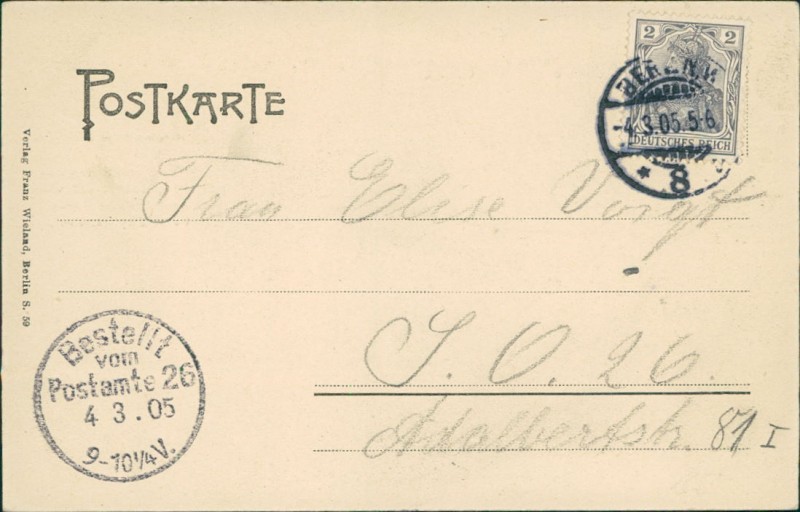 Alte Ansichtskarte aus Berlin, gelaufen am 04.03.1905 von Berlin nach Berlin S.O. 26. Ankunft in Berlin S.O. 26 am 04.03.1905.