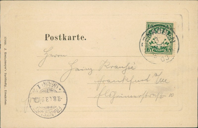 Alte Ansichtskarte aus Edenkoben, gelaufen am 03.08.1903 von Edenkoben nach Frankfurt. Ankunft in Frankfurt am 03.08.1903.