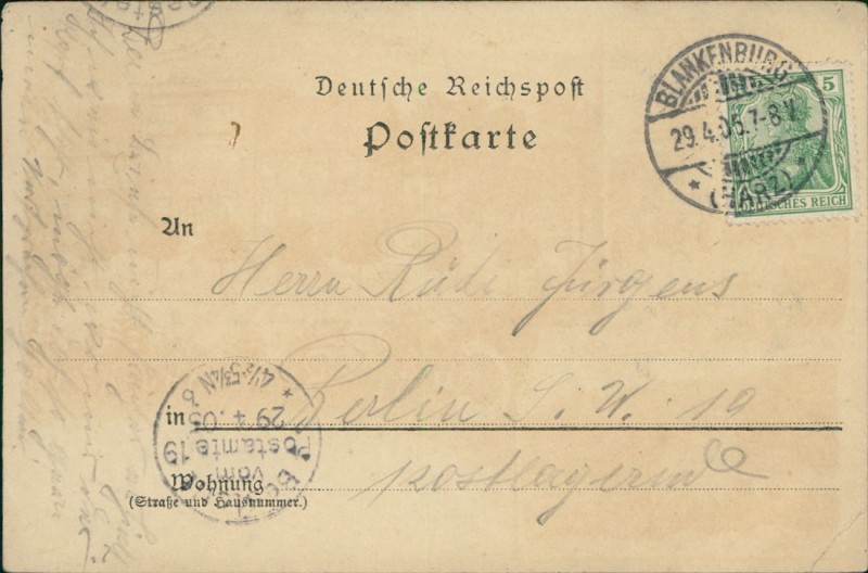 Alte Ansichtskarte aus Blankenburg (Harz), gelaufen am 29.04.1905 von Blankenburg (Harz) nach Berlin S.W. 10. Ankunft in Berlin S.W. 10 am 29.04.1905.