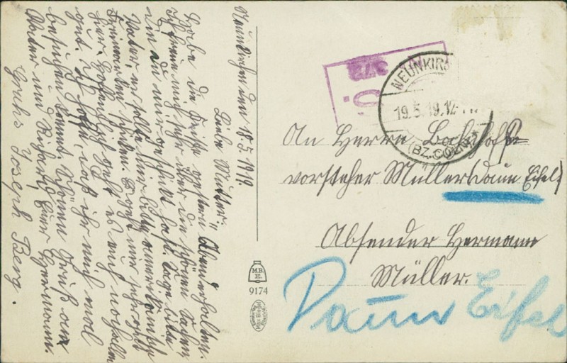 Alte Ansichtskarte aus Neunkirchen, gelaufen am 19.05.1919.