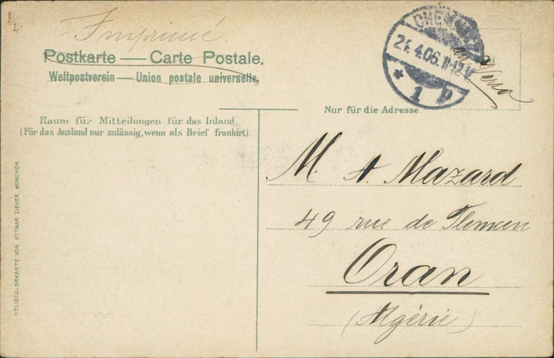 Alte Ansichtskarte aus Chemnitz, gelaufen am 24.04.1906 von Chemnitz nach Oran.