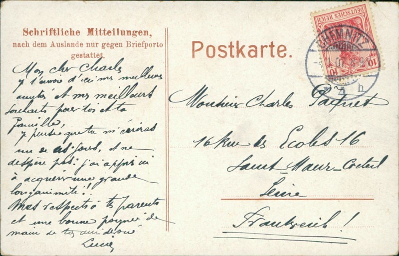 Alte Ansichtskarte aus Chemnitz, gelaufen am 04.01.1907.