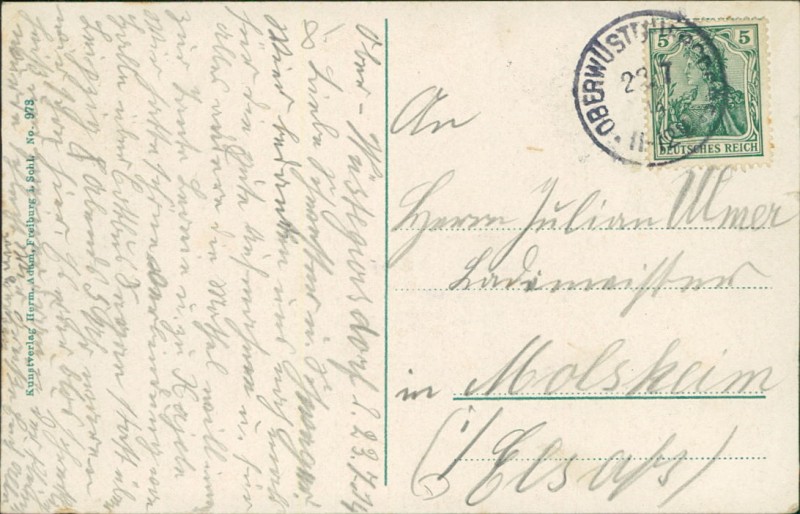 Alte Ansichtskarte aus Wüstegiersdorf / Głuszyca, gelaufen am 23.07.1914 von Oberwüstegiersdorf nach Molsheim.