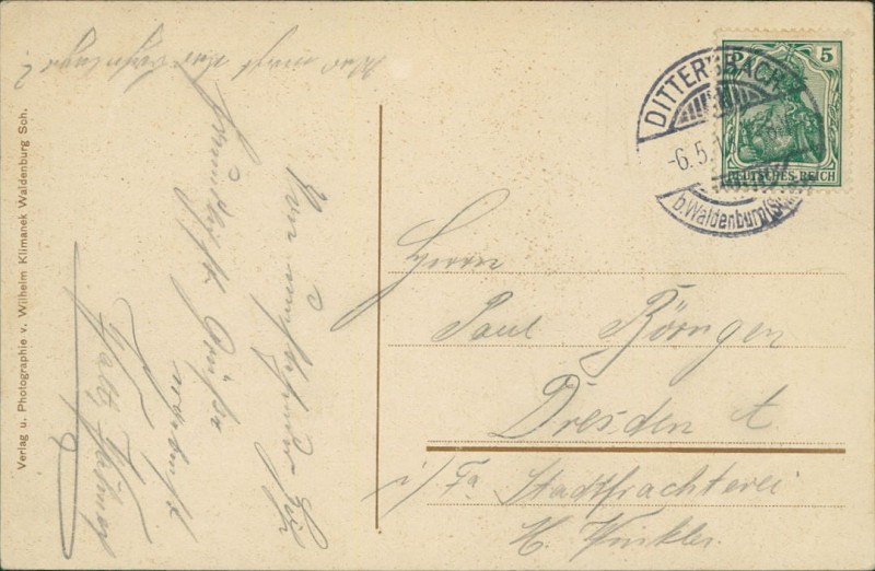 Alte Ansichtskarte aus Waldenburg / Wałbrzych, gelaufen am 06.05.1916 von Dittersbach nach Dresden A.
