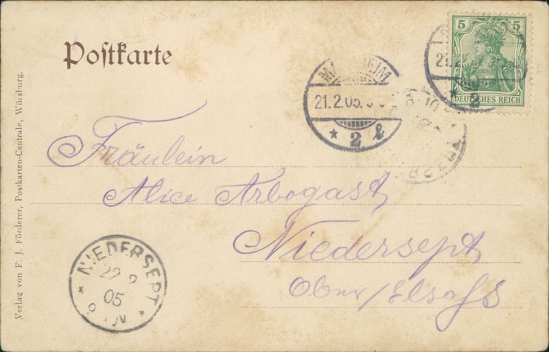 Alte Ansichtskarte aus Würzburg, gelaufen am 21.02.1905 von Mannheim nach Niedersept. Ankunft in Niedersept am 22.02.1905.