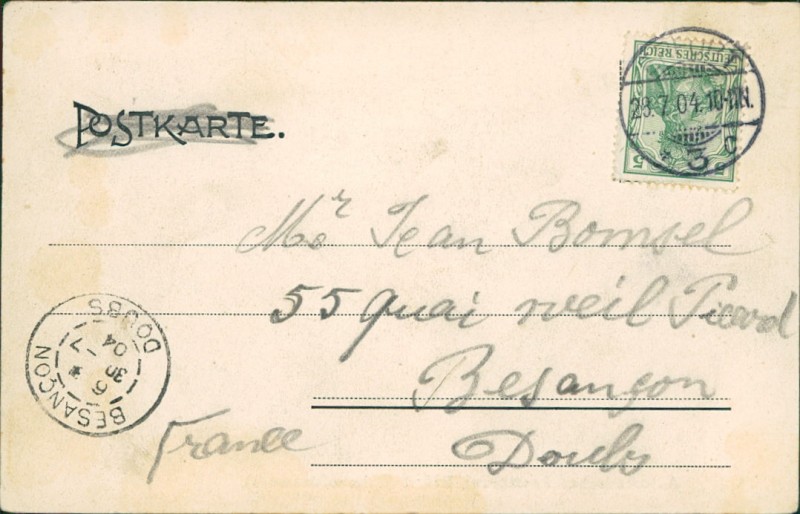 Alte Ansichtskarte aus Erfurt, gelaufen am 28.07.1904 von Erfurt nach Besancon. Ankunft in Besancon am 30.07.1904.