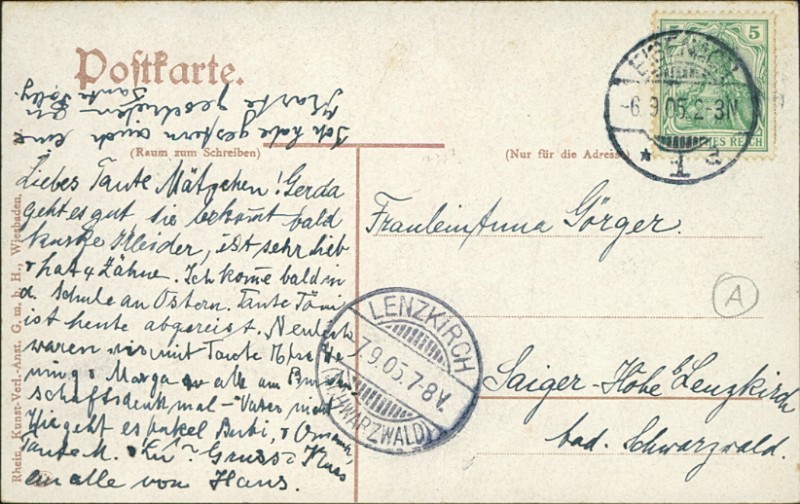 Alte Ansichtskarte aus Eisenach, gelaufen am 06.09.1905 von Eisenach nach Lenzkirch (Schwarzwald). Ankunft in Lenzkirch (Schwarzwald) am 07.09.1905.