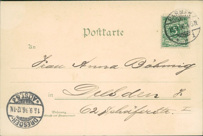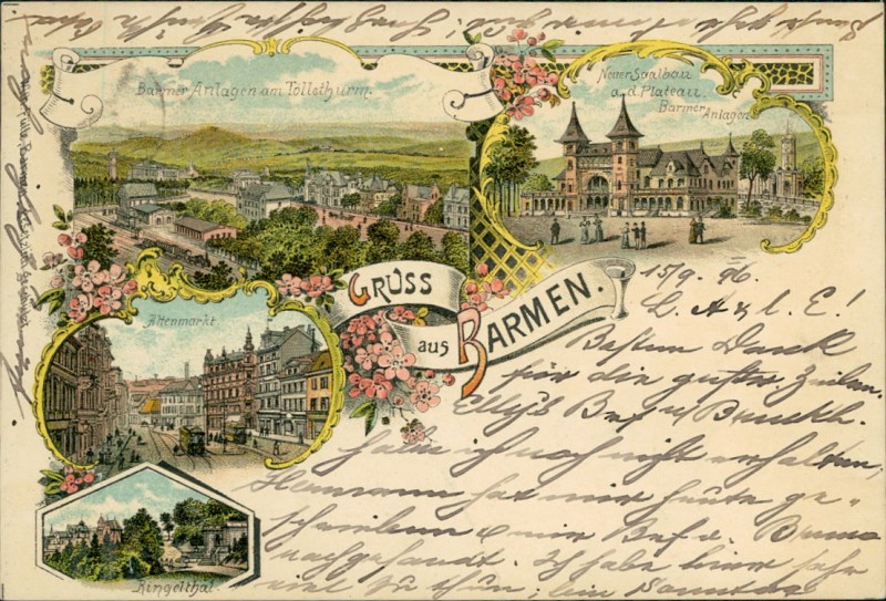 Alte Ansichtskarte aus Wuppertal, gelaufen am 15.09.1896 von Barmen nach Dresden. Ankunft in Dresden am 16.09.1896.