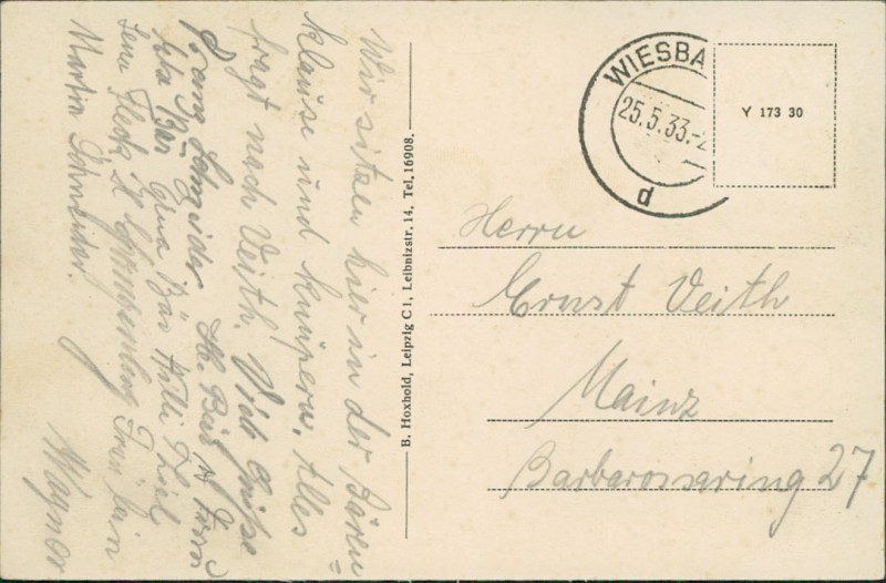 Alte Ansichtskarte aus Wiesbaden, gelaufen am 25.05.1933 von Wiesbaden nach Mainz.