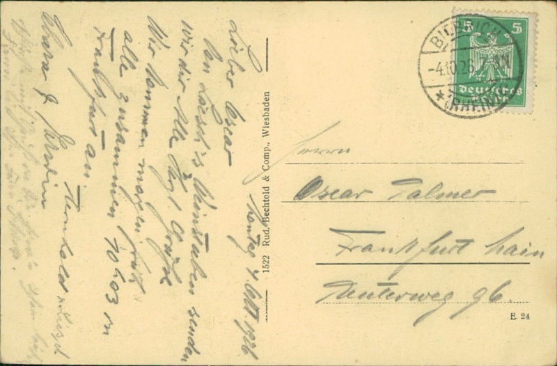 Alte Ansichtskarte aus Wiesbaden, gelaufen am 04.10.1926 von Biebrich nach Frankfurt Main.